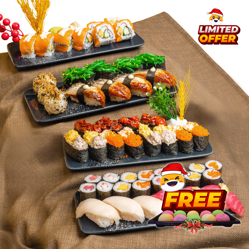 SALMON MAKI / TAMAGO MAKI / KANI MAKI / MAGURO MAKI / SHIRO MAGURO SUSHI / MAGURO AVOCADO SUSHI / TUNA TAMAGO MAYO GUNKAN / SALMON EBIKO MAYO GUNKAN / UNAGI MAYO SUSHI / FURIKAKE BALL / CHUKA IDAKO GUNKAN / CHUKA WAKAME GUNKAN / SALMON MAYO MAKI